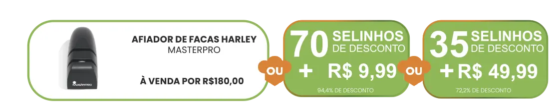 O período para acumular selos de desconto e comprar as facas, afiador e tábua Harley MasterPRO com e sem desconto é de 25/08/2025 a 07/12/2025.