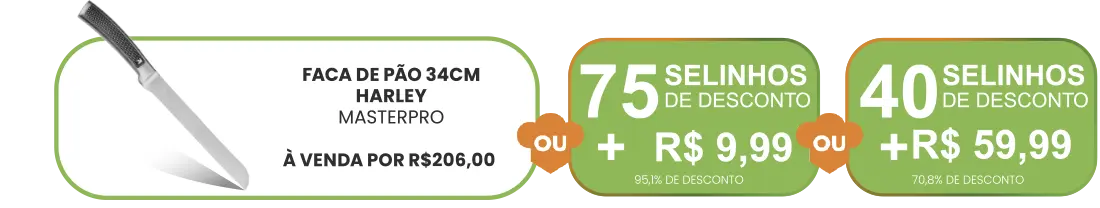 PERÍODO PARA ACUMULAR SELOS DE DESCONTO: 25/08/2025 a 07/12/2025 (OU ENQUANTO DURAR O ESTOQUE DOS PRODUTOS, O QUE OCORRER PRIMEIRO NAS LOJAS ALVORADA PARTICIPANTES). DE 24/11/2025 A 21/12/2025 NÃO HAVERÁ A DISTRIBUIÇÃO DE SELOS DE DESCONTO, MAS O CLIENTE PODERÁ COMPRAR AS FACAS, AFIADOR OU TÁBUA HARLEY, DA MARCA AUSTRÍACA MASTERPRO PARTICIPANTES, *FABRICADAS NA CHINA*, COM OU SEM DESCONTO, CONFORME DISPONIBILIDADE DE ESTOQUE. A cada R$30,00 em compras nas lojas físicas Alvorada, bem como, no site https://www.alvoradaemcasa.com.br/p e Aplicativo Alvorada + Você, o Cliente terá direito a 01 (um) selo de desconto, para acumular e comprar as facas, afiador ou tábua Harley, da marca austríaca MasterPRO participantes, com o desconto que fizer jus. Quantidade máxima de 200 selos entregue por transação/compra, independentemente do valor total pago pelo Cliente. Os valores residuais dos comprovantes fiscais serão desconsiderados para obtenção de novos selos de desconto. A compra dos produtos colecionáveis com desconto será limitada a 14 produtos por CPF. Estão excluídos para fins de entrega de selos de desconto os valores referentes à: devolução ou troca de produtos, tabaco, fumo e seus derivados, bebidas alcoólicas com graduação acima de 13%, medicamentos, serviços, fórmulas Infantis para Lactentes e de seguimento para Lactentes (0-12 meses de idade), compras realizadas por aplicativos de entrega como Ifood, Rappi ou sites que venham a comercializar produtos das lojas Alvorada, que não o próprio Alvorada e a compra com desconto das facas, afiador ou tábua Harley, da marca austríaca MasterPRO. Nenhuma oferta de voucher ou desconto, independentemente da sua forma ou origem, será considerada elegível para a geração de selos nesta Campanha. Os valores das compras não são cumulativos. É permitida a compra com desconto de apenas 01 (um) produto por cada cartela. Os participantes concordam em ceder, de forma gratuita, os direitos de uso de imagem e som de voz, sem qualquer ônus para a Realizadora, para uso exclusivo na divulgação desta Ação, pelo período de doze meses após seu término. Os participantes autorizam a Realizadora a proceder com o tratamento de seus dados pessoais fornecidos para cadastro e gozo dos benefícios da Campanha para finalidade de controle, segurança e promoção da campanha, não utilizar material abrasivo na limpeza das facas, tábua ou afiador. De acordo com a lei (Lei nº 11.265, de 3 de janeiro de 2006, e regulamentações subsequentes “LEGISLAÇÃO LOCAL”) que visa proteger o aleitamento materno e que regulamenta a comercialização dos produtos destinados à alimentação de lactentes e crianças de primeira infância, foram excluídos para geração de selos na campanha, as Fórmulas Infantis para Lactentes e de seguimento para Lactentes (0-12 meses de idade). Consulte todas as regras de participação no site: https://www.alvoradaemcasa.com.br/fasdeselinhos.
