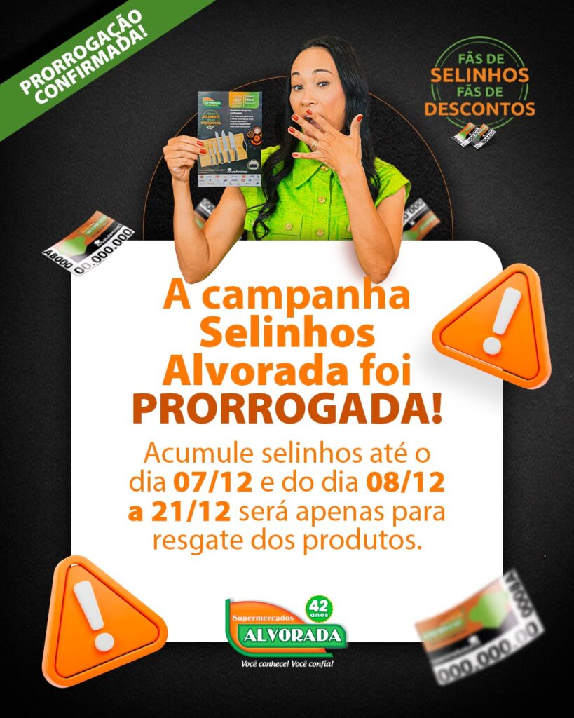 Do dia 24/11/2025 ao dia 21/12/2025 não haverá a entrega de selos de desconto, mas os clientes Alvorada poderão comprar os produtos participantes da campanha disponíveis pelo valor regular (sem desconto) ou com desconto, conforme sua preferência e quantidade necessária de selos de desconto que possuírem ou enquanto durarem os estoques.
